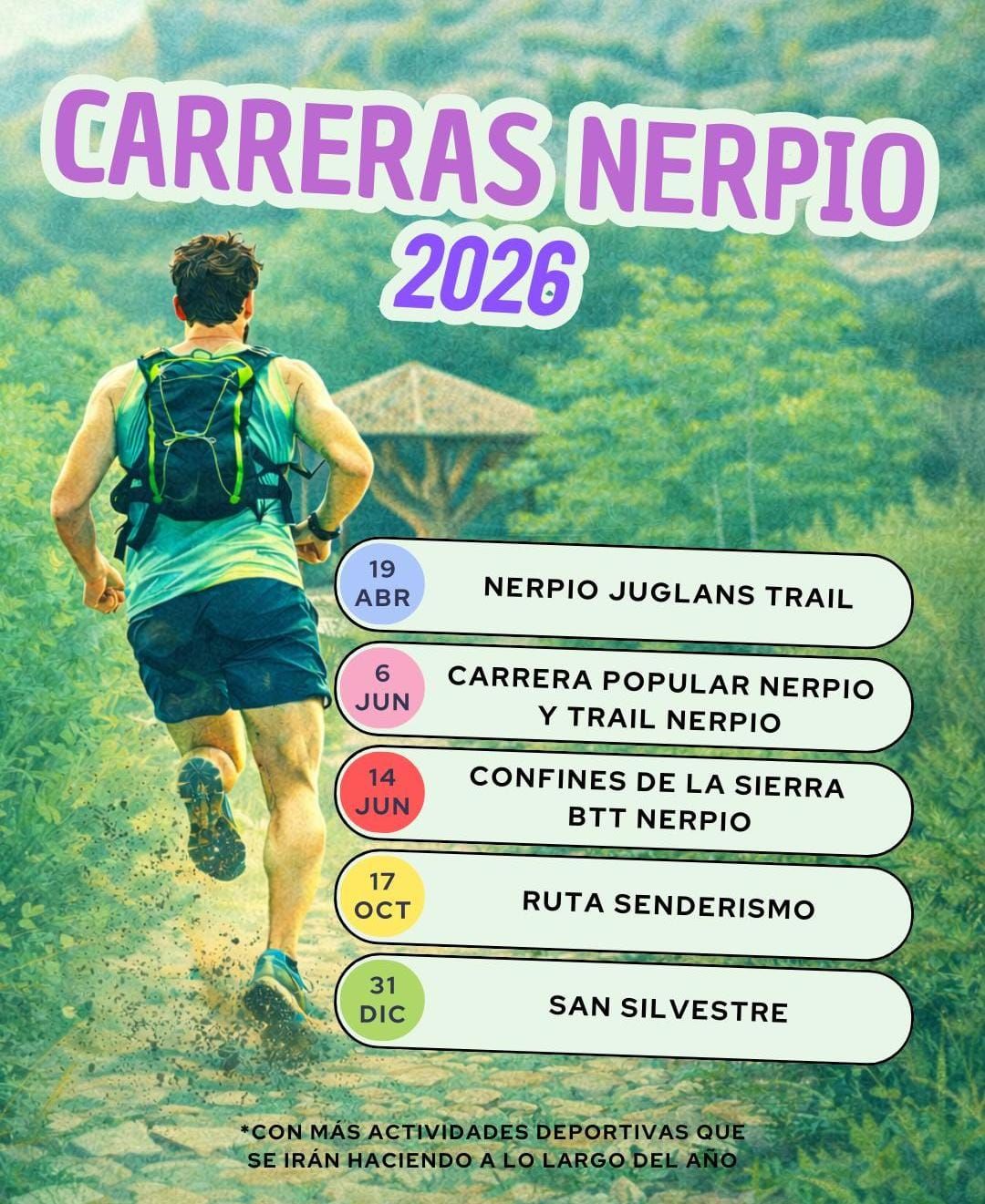 Os avanzamos el calendario deportivo que hemos elaborado para este 2026 con diferentes pruebas para todas las edades 🏃♀️🏃♂️🔜🚵♀️🚵♂️🔜🚶♂️🚶♀️, en línea con el trabajo que venimos realizando para fomentar hábitos saludables, favorecer la convivencia e impulsar el espíritu deportivo en nuestro municipio 🎽🎽.
